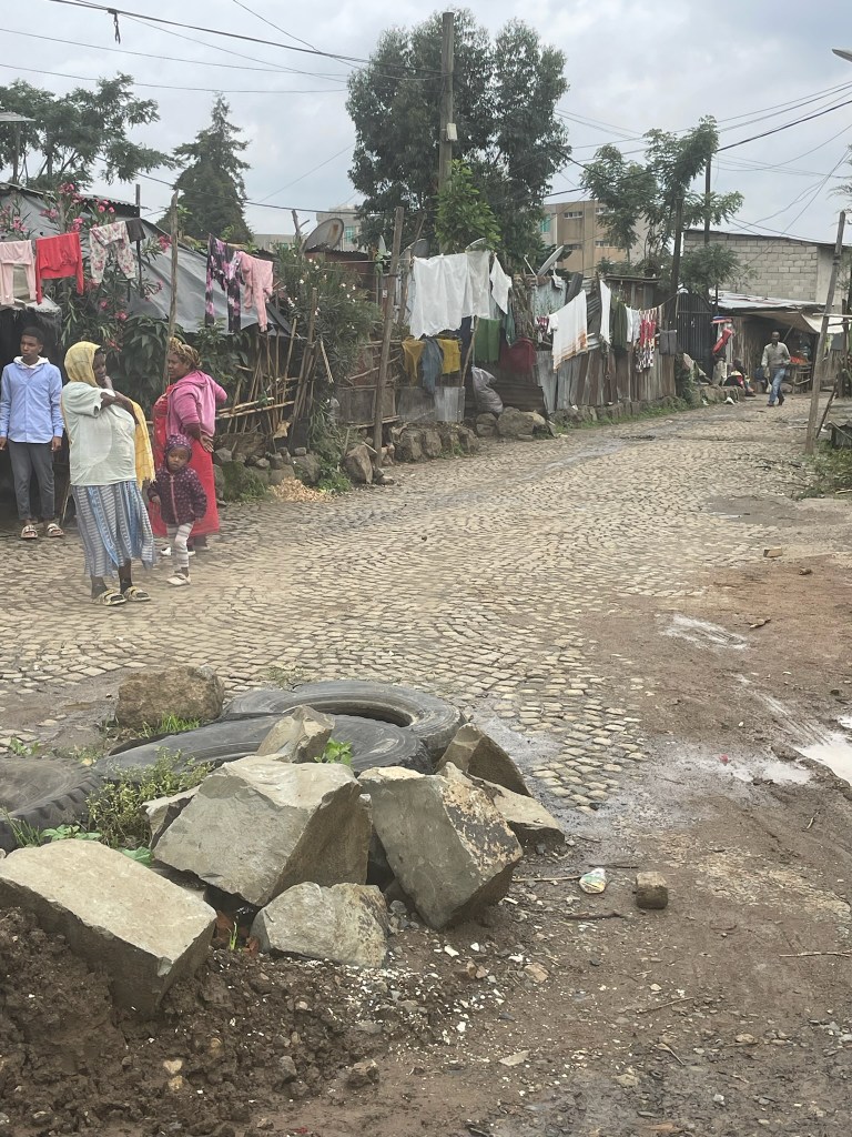 The situation in which they live is not because they are lazy or unproductive. One woman washed clothes in her home (by hand) for her work. In another home, the father worked as a security guard and the mother worked making injera (a kind of Ethiopian tortilla). As you walk the streets, there are people collecting empty plastic bottles, doing day labor jobs, and cooking simple food to sell on the street. There are people selling items in small booths or shops everywhere. Laborers work hard, dangerous jobs without OSHA standards. I saw men sending cement several stories up by rope, on wooden scaffolding without safety harnesses. Most of the laborers I saw were only using simple hand tools, no Milwaukee Pack Out in sight. In the middle of a small parking lot, I saw people set up in what might be mistaken for a small-town farmers market in the States. They were selling fruits and vegetables, some other small items, and used car tires.