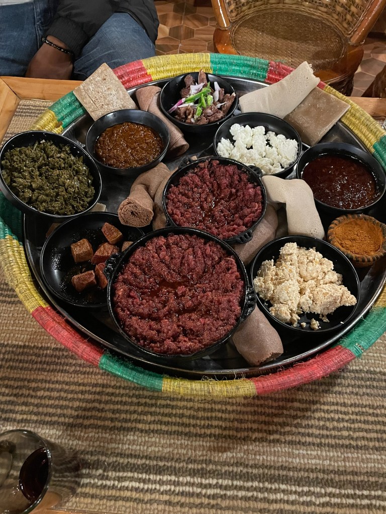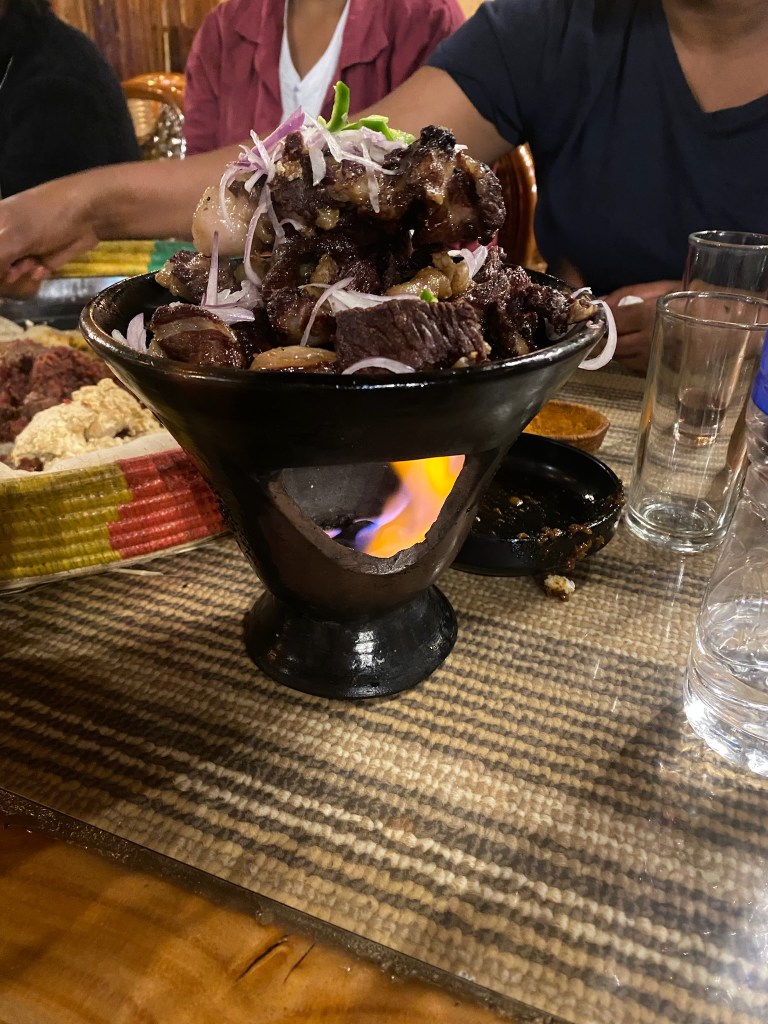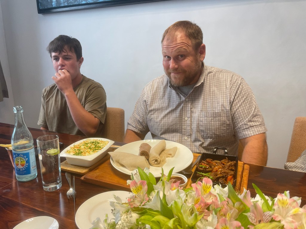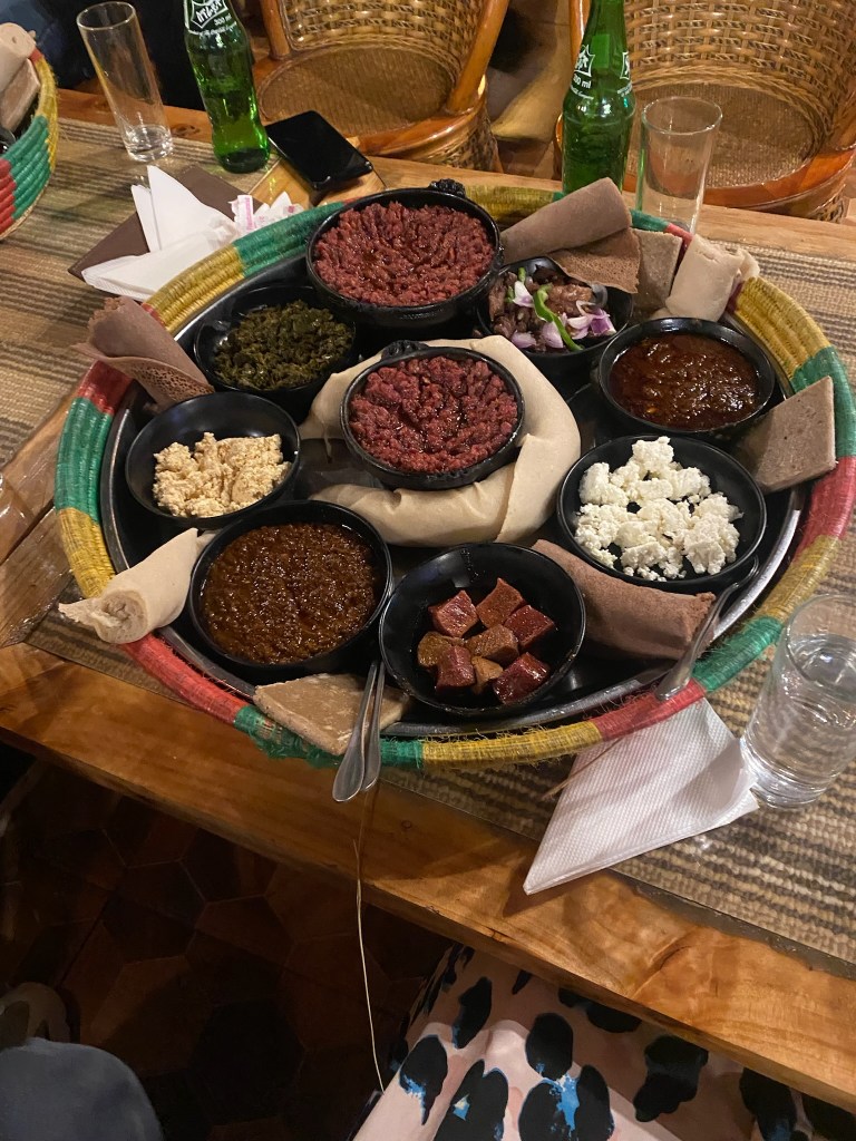 They brought out giant platters of food, most of which I still have no idea what it was. Two of the dishes were similar to what we call beef tartar. So, if you don’t like raw meat, be careful what you eat! There is a tradition going back several generations for why they like to eat raw beef. I think it has something to do with not having fires as they were in battles with the Italians in the late 1800s. There was another dish sitting on our table called tibs which was on top of a fire. Tibs are basically fajitas, and these were fantastic. My favorite drink that I had at nearly all my meals was ambo which is similar to San Pelligrino or Perrier. I’m a pretty fancy guy which is why I ordered that, but you also can’t drink the tap water.
